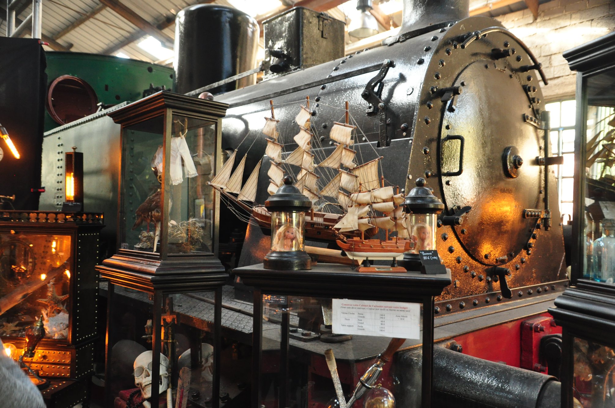 clothing · hats · whisky · jewellery · leather · hanging gardens · steampunk creations · accessories (socks, hats, bow tie etc) · decoration · sculptures · paintings · comics · glasses · curiosity cabinet · antiquities · militaria · bird feathers · clocks · photobooth · illustrations · entomology ·